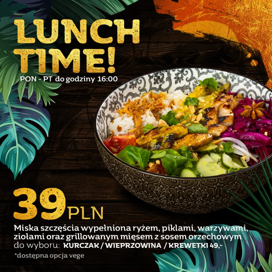 Całość dopełnia grillowane mięso oraz aksamitny sos orzechowy, który nadaje daniu głębi i charakteru. Lunch dostępny jest w trzech wariantach białka: